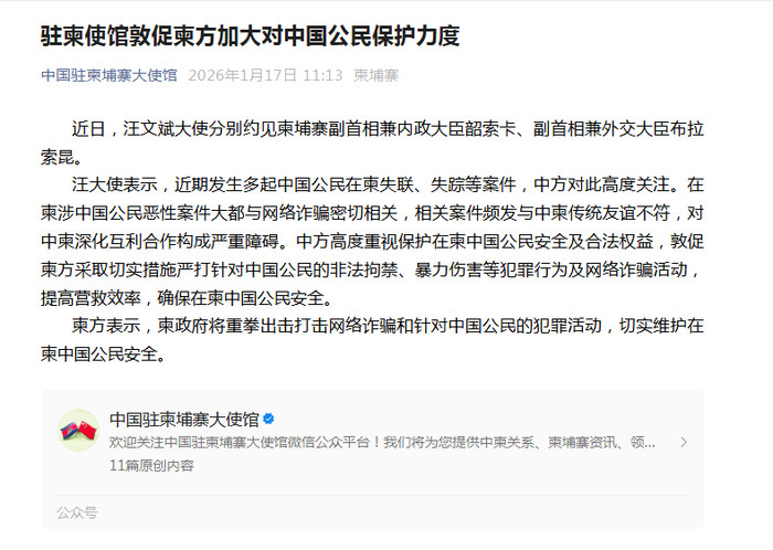 柬方表示,柬政府将重拳出击打击网络诈骗和针对中国公民的犯罪活动,切实维护在柬中国公民安全。